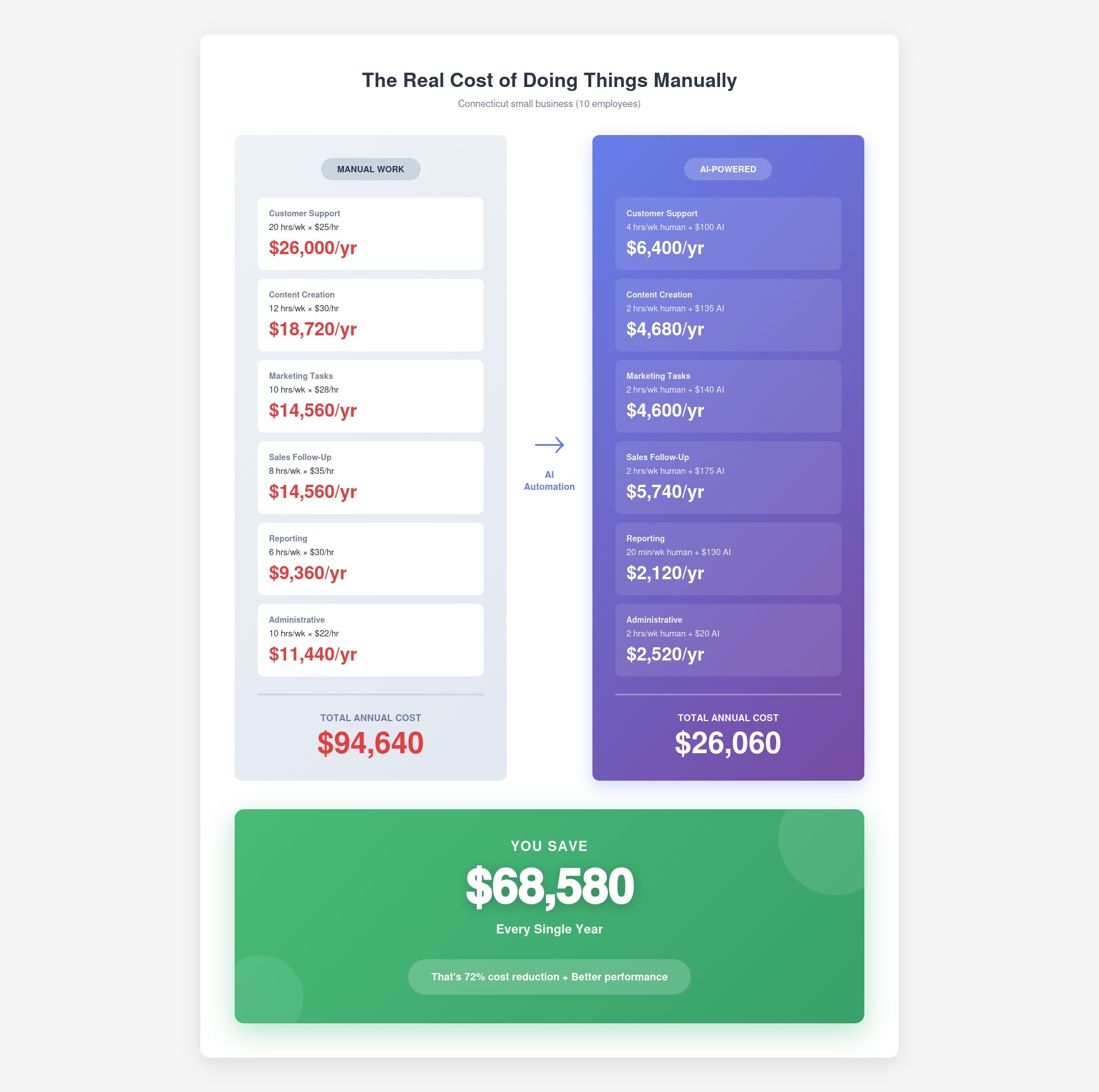 But here's what's changing: Connecticut small businesses are now using AI tools to cut operational costs by 40% while actually improving service quality.
