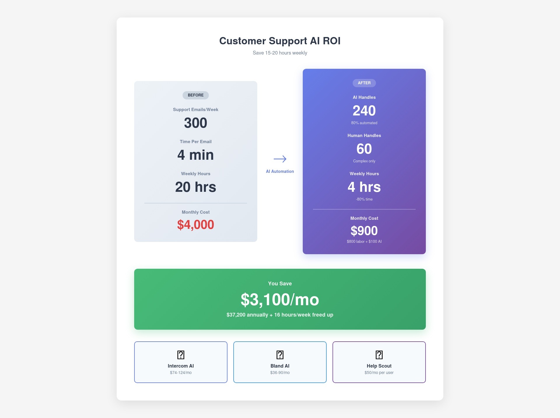 The Problem: Customer support is a time vampire. Every email, phone call, and chat message pulls you or your team away from revenue-generating work. Hiring support staff costs $40k-55k per year. And customers expect instant responses—not next-business-day replies.