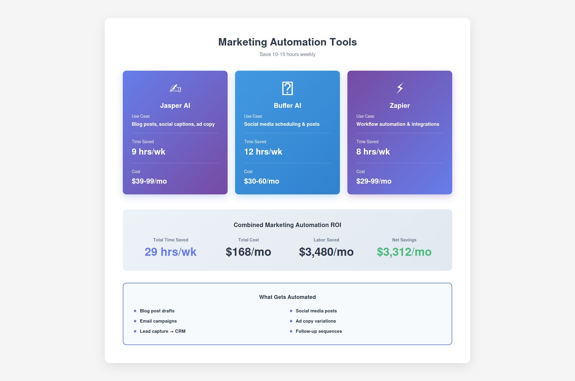 TaskHours/WeekHourly CostWeekly CostAnnual CostCustomer support20 hrs$25/hr$500$26,000Content creation12 hrs$30/hr$360$18,720Marketing tasks10 hrs$28/hr$280$14,560Sales follow-up8 hrs$35/hr$280$14,560Reporting/analytics6 hrs$30/hr$180$9,360Administrative10 hrs$22/hr$220$11,440