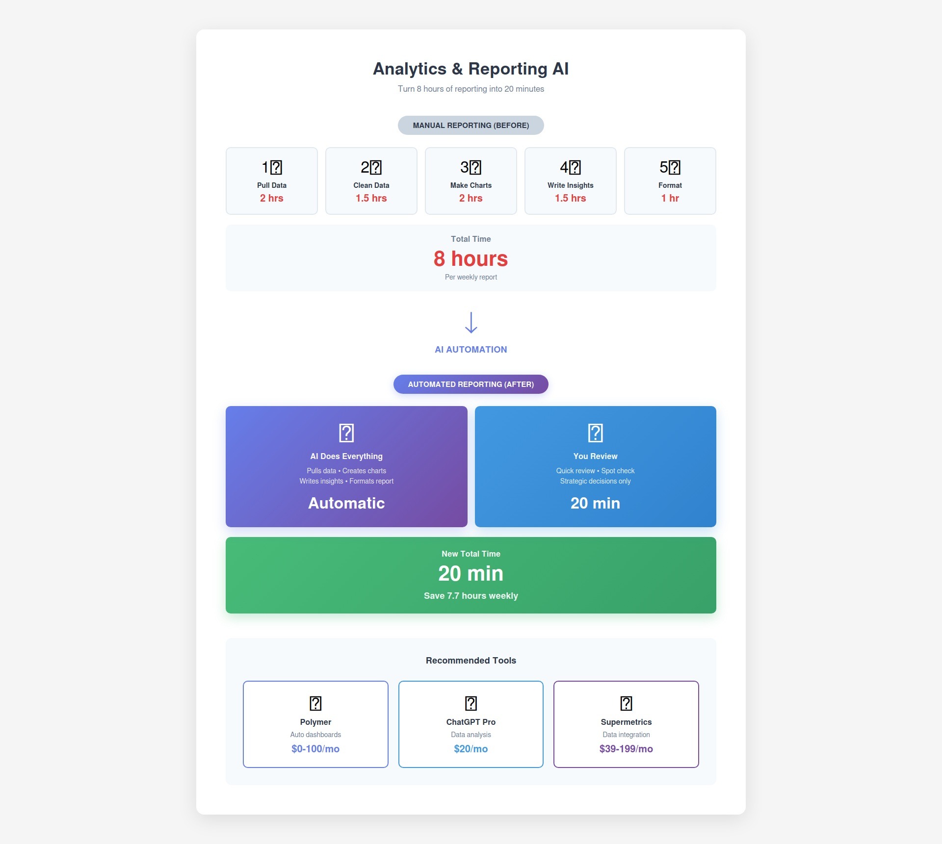 The Problem: Business reporting is essential but tedious. Pulling data from Google Analytics, Google Ads, CRM, social media—then creating charts, writing insights, formatting reports—takes 5-10 hours per week.