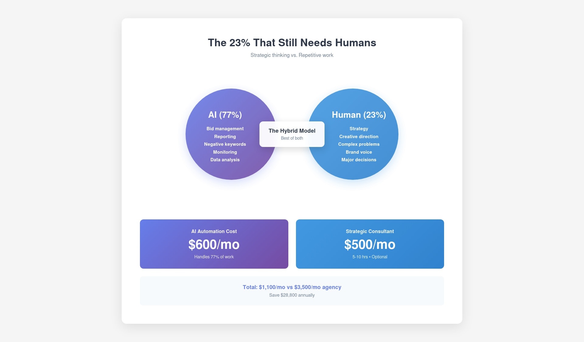 The smart approach isn't "AI vs. Agency." It's "Google Ads AI automation handles 77% of repetitive work, humans handle 23% of strategic work."