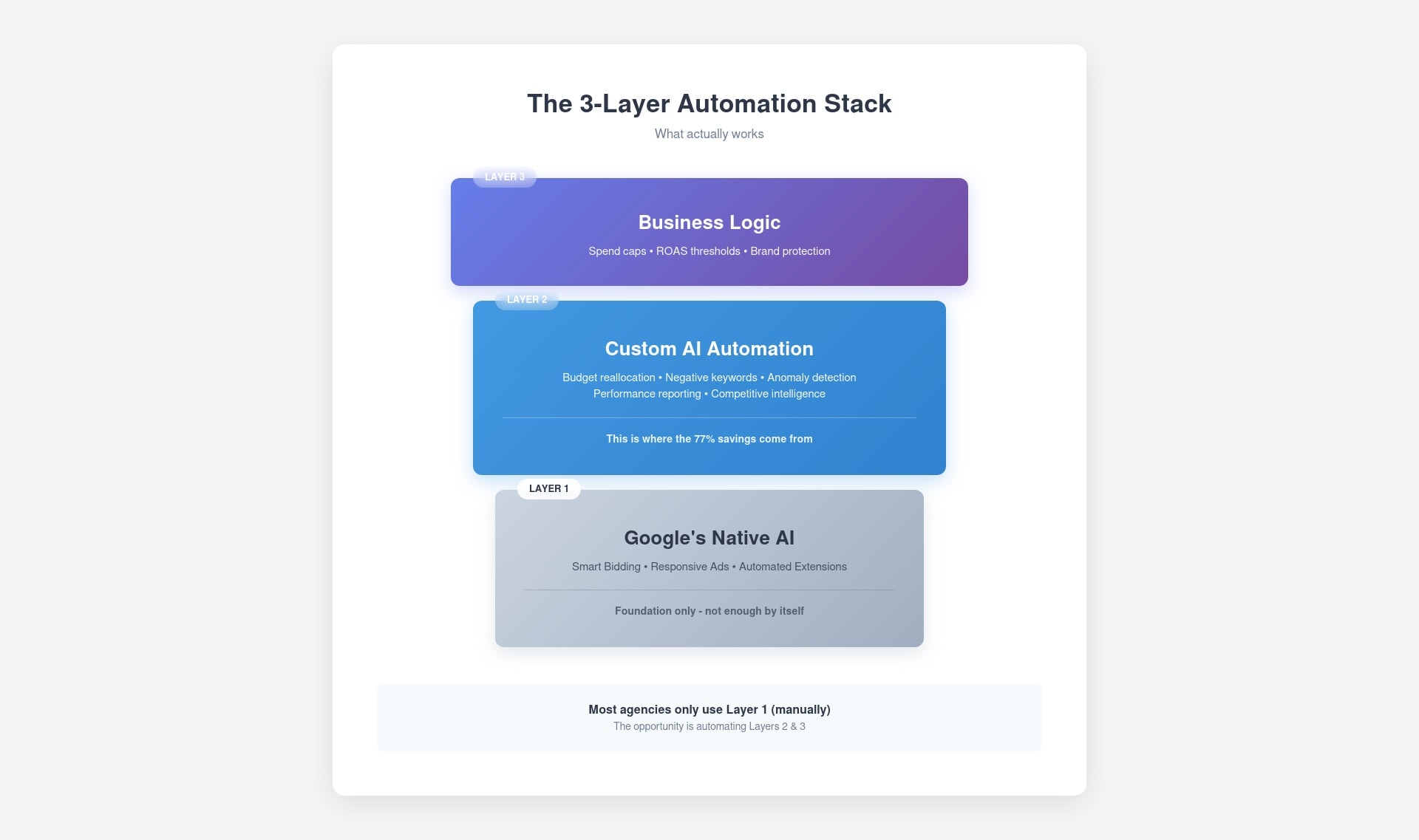 Most agencies manually manage Layer 1 (slow and expensive). The real opportunity is automating Layers 2-3 with advanced Google Ads automation tools.