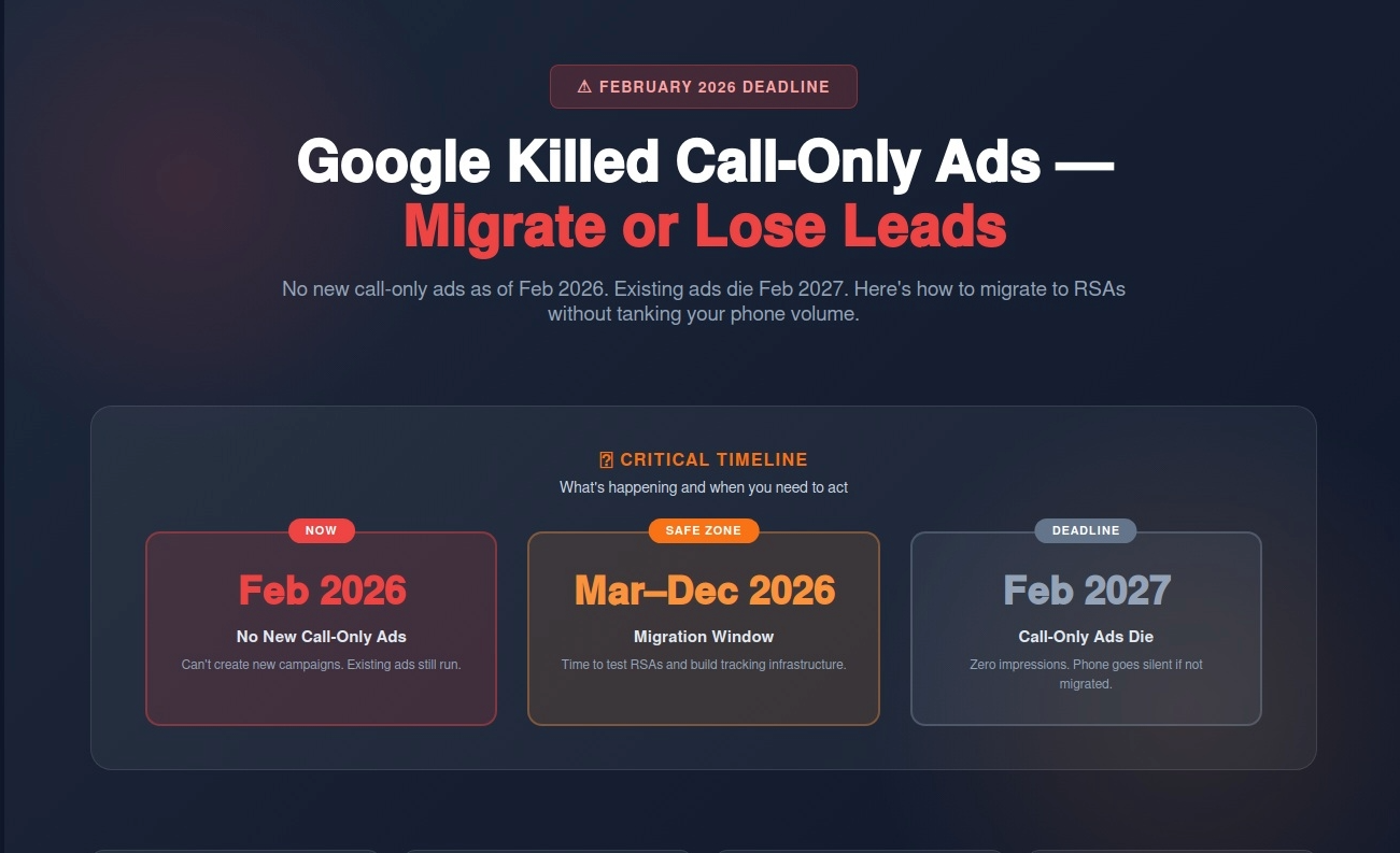 Google killed call-only ads in February 2026. Here's how local service businesses can migrate to responsive search ads with call assets without losing phone leads or tracking accuracy.
