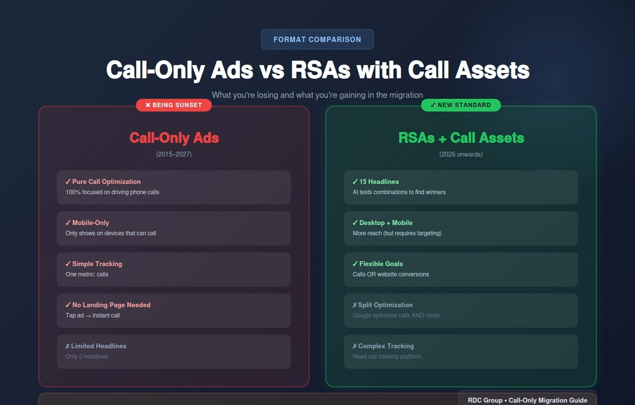 Here's what Google told advertisers: "Call-only ads limit our ability to optimize across formats. RSAs with call assets give us more flexibility to show the right ad at the right time."