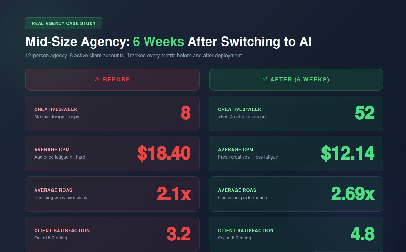 What was happening: Creative fatigue was hitting every account. CPMs were climbing. Clients were complaining that their ads looked stale. The strategist was spending 60% of their time on research that could have been automated. The designers were underwater.