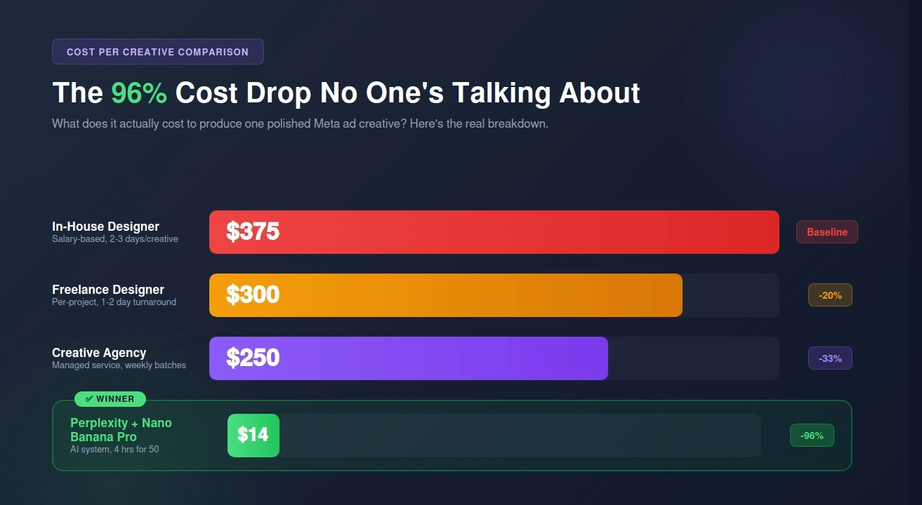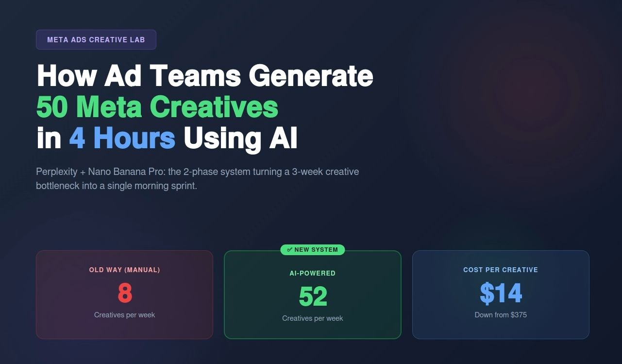 Tool cost: $620/month for Perplexity + Nano Banana Pro. Internal time: 4 hours per week (anyone on the team can run it). Output: 40–50 creatives per week. Turnaround: 2 days.
