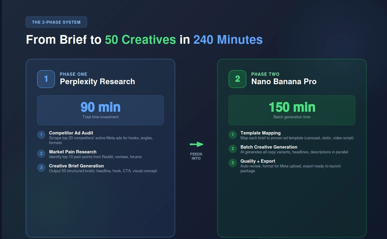 The Perplexity + Nano Banana Pro system doesn't try to do everything at once. It splits creative production into two phases. Phase 1 is strategy — the angles, hooks, and concepts. Phase 2 is execution — turning those concepts into actual ads. Each tool owns one phase. Together, they do in 4 hours what takes a team 2 months manually.