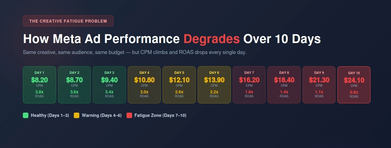 Creative fatigue is simple: your audience has seen your ad enough times that they stop engaging. When that happens, Meta charges you more to show it to people who haven't seen it — because the people who have are ignoring it.