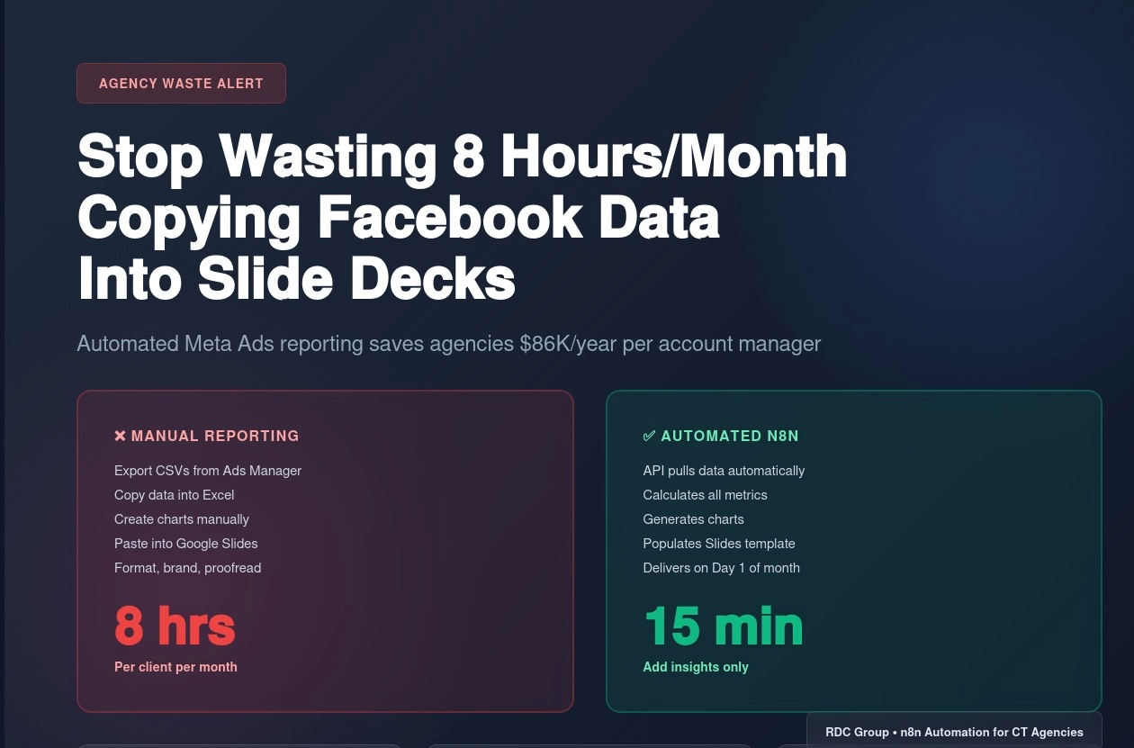 I'm Renzo, founder of RDC Group. We build automation systems for Connecticut marketing agencies. Over the past year, we've helped 8 agencies eliminate manual Meta Ads reporting entirely using n8n workflows that auto-generate client reports.
