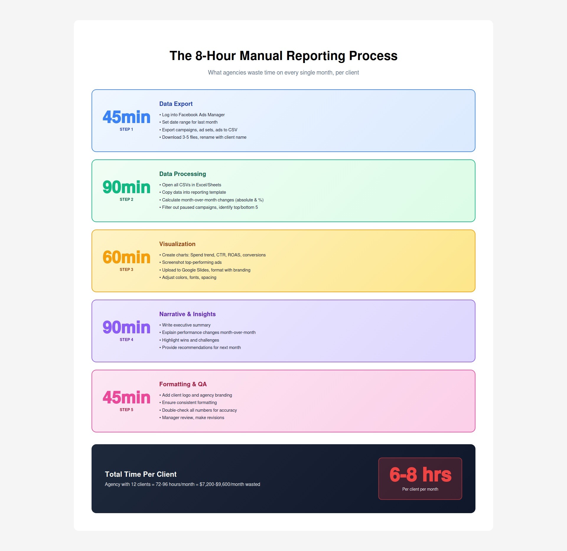 You open Facebook Ads Manager. Export campaign data to CSV. Copy numbers into Excel. Create charts. Take screenshots of top-performing ads. Paste everything into Google Slides. Format. Adjust colors. Add your agency branding. Write commentary. Repeat for 12 clients.