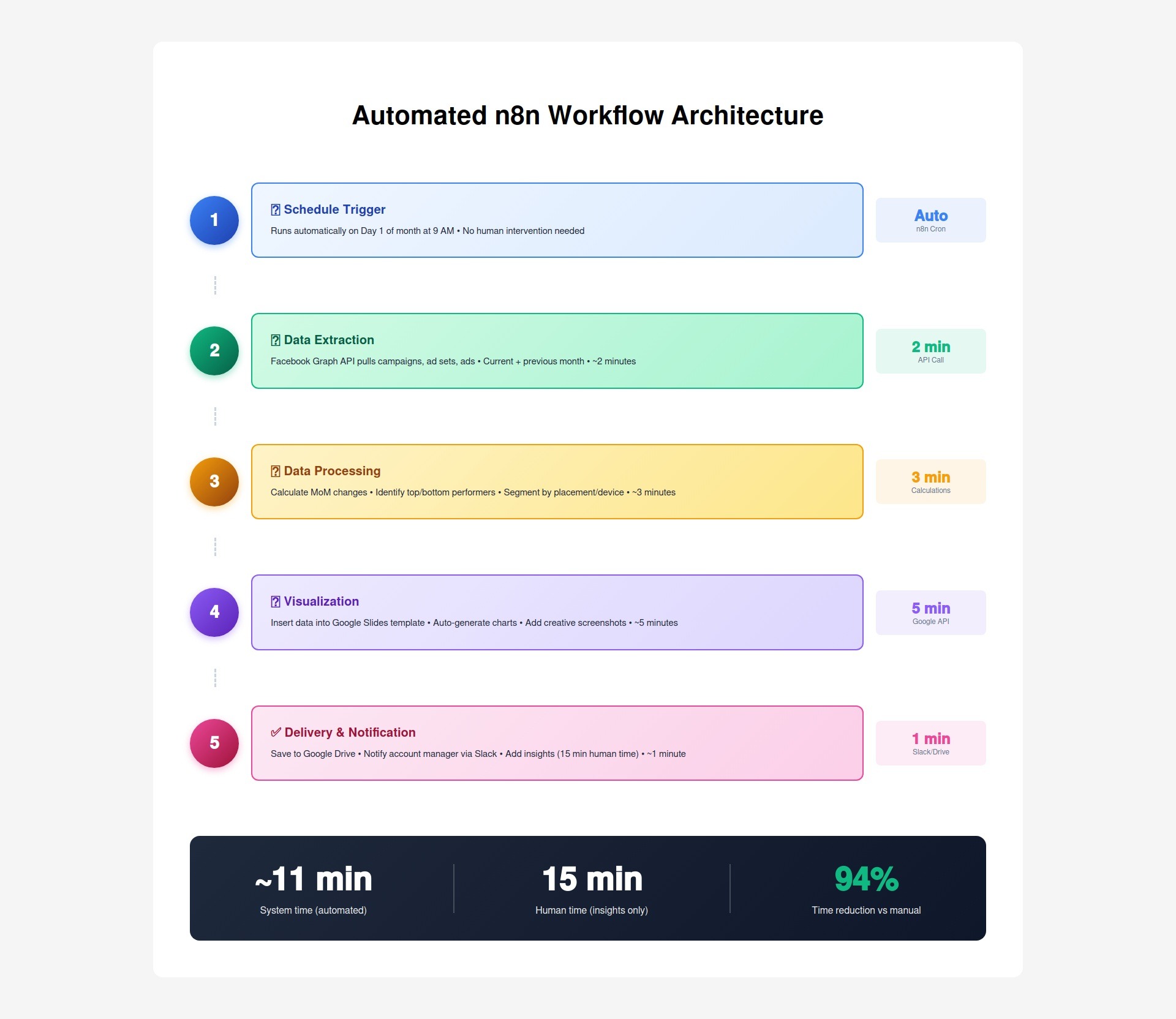 The solution: Automated n8n workflow that extracts data, calculates metrics, generates charts, and populates Google Slides templates.