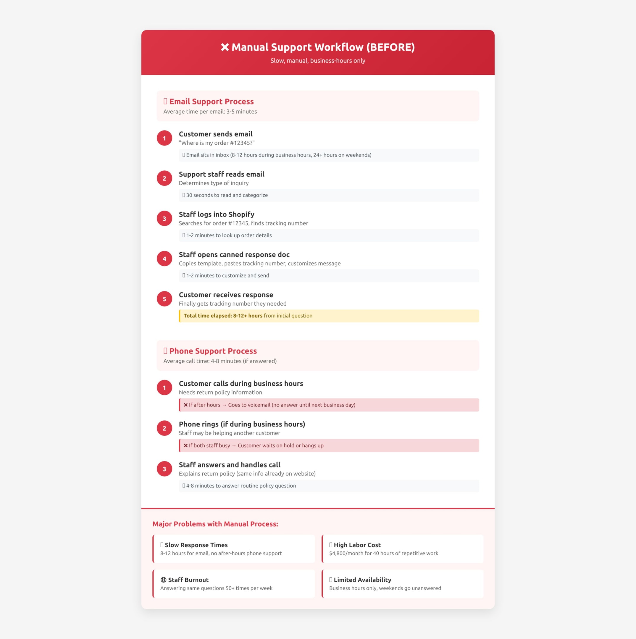 Staff spent 12 hours weekly on phone support, with at least 8 of those hours answering questions that didn't require human judgment