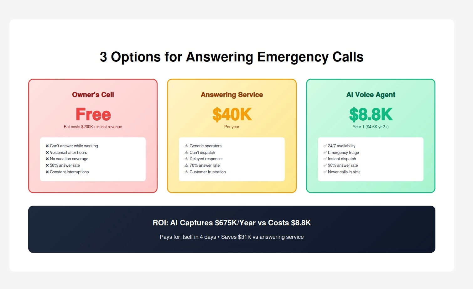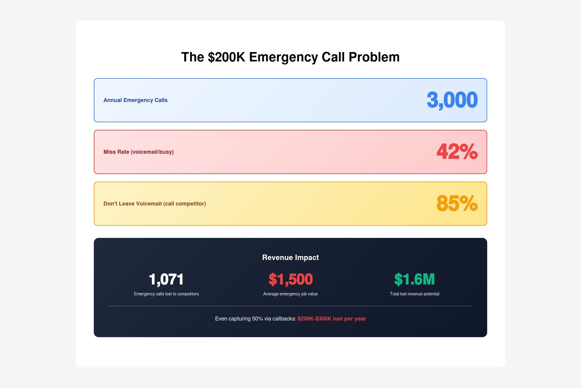 And that's just emergency calls. Add routine service requests, maintenance, inspections - the total missed revenue approaches $200,000-$300,000 per year.