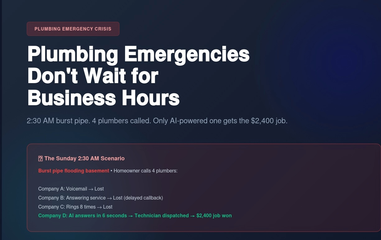 Company A: Voicemail - "Call back Monday 8 AM" Company B: Answering service - "We'll pass the message to the on-call plumber" Company C: Rings 8 times, no answer Company D: AI voice agent answers in 6 seconds → Technician dispatched in 3 minutes