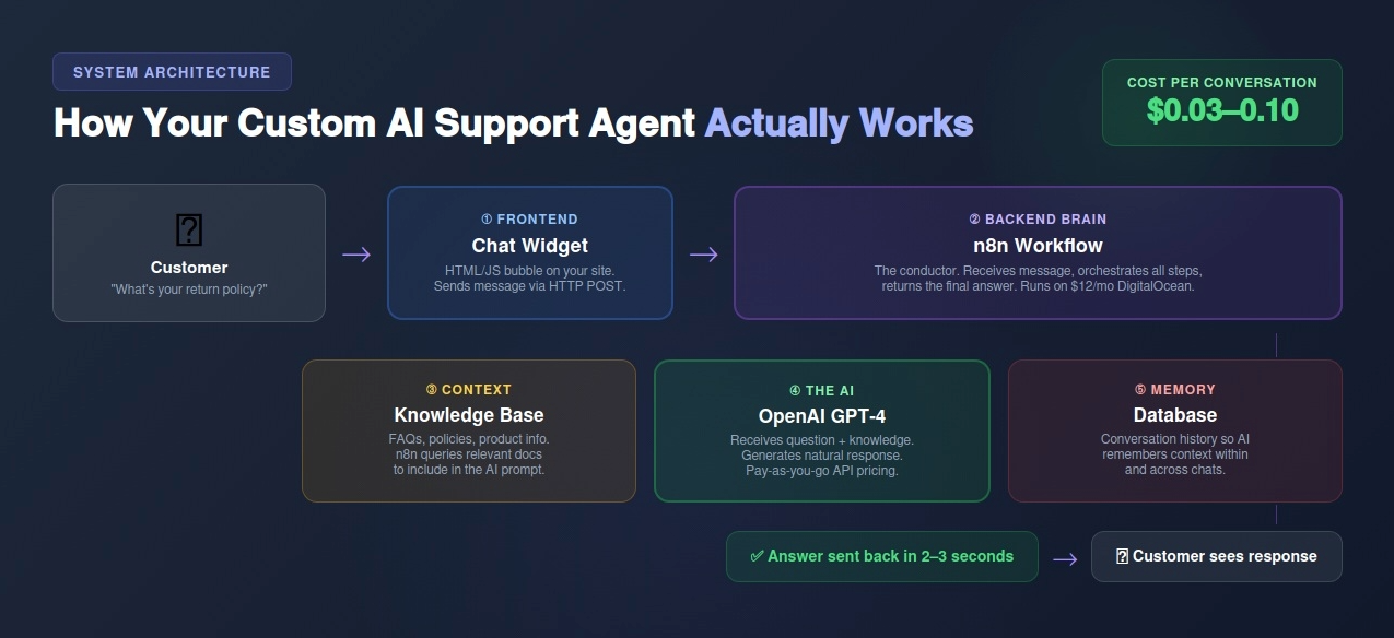 1. Chat Widget (Frontend) Your customer sees a chat bubble on your website. They type a question. This is pure HTML/JavaScript that you embed on your site.