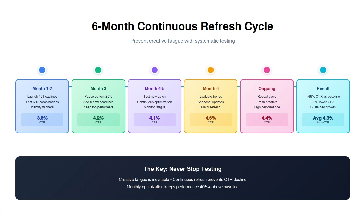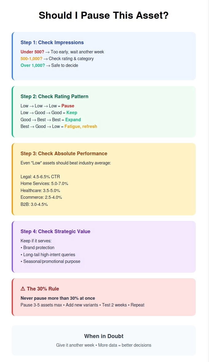 Rule: Never pause all assets at once. Always maintain 10-12 active headlines minimum so Google has options to test.