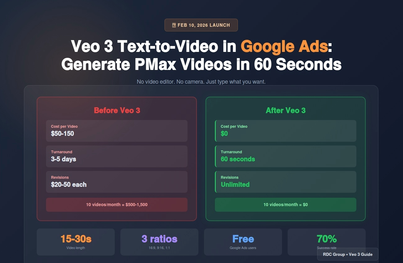 Google launched Veo 3 text-to-video in Asset Studio (Feb 2026). Generate Performance Max video ads from text prompts in 60 seconds. Here's how to use it and what actually works.
