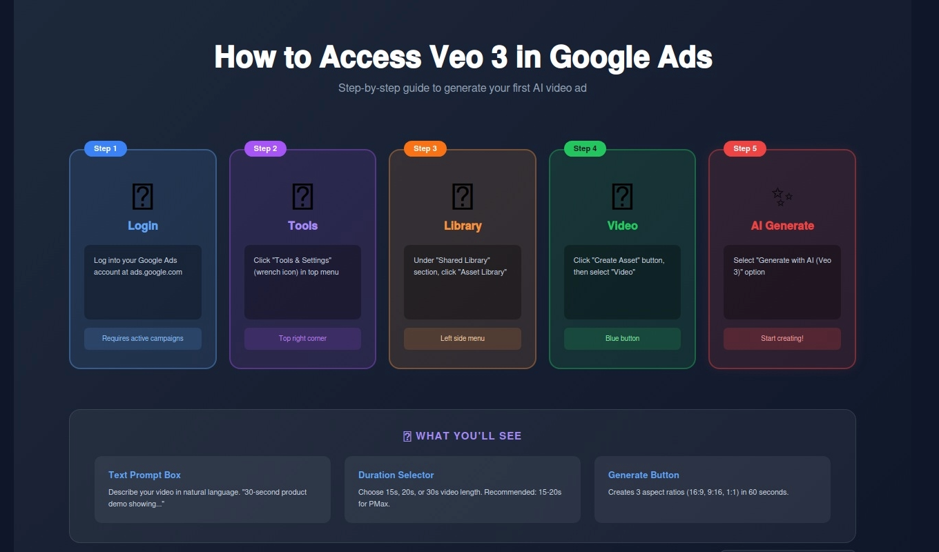 For the first time, you can generate Performance Max video ads by typing a text prompt. No video editing. No hiring videographers. Just describe what you want and Veo 3 creates a 15-30 second video in under 60 seconds.