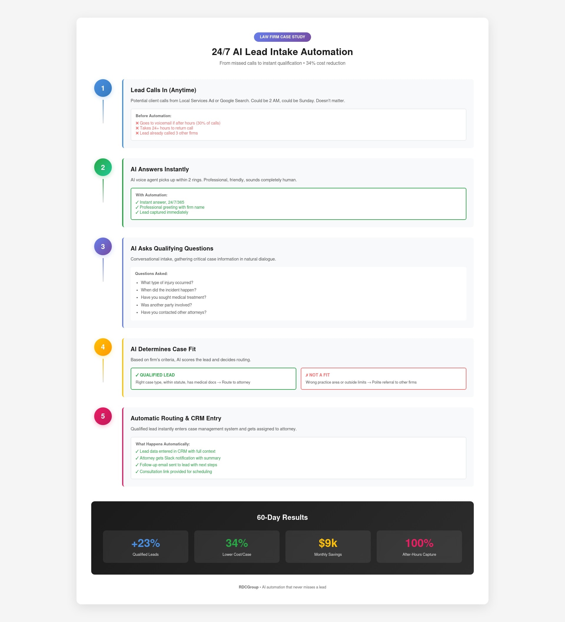 A mid-size personal injury law firm in Connecticut was spending $18,000 monthly on Local Services Ads and Google Search campaigns. They were getting leads, but the process was bleeding money.