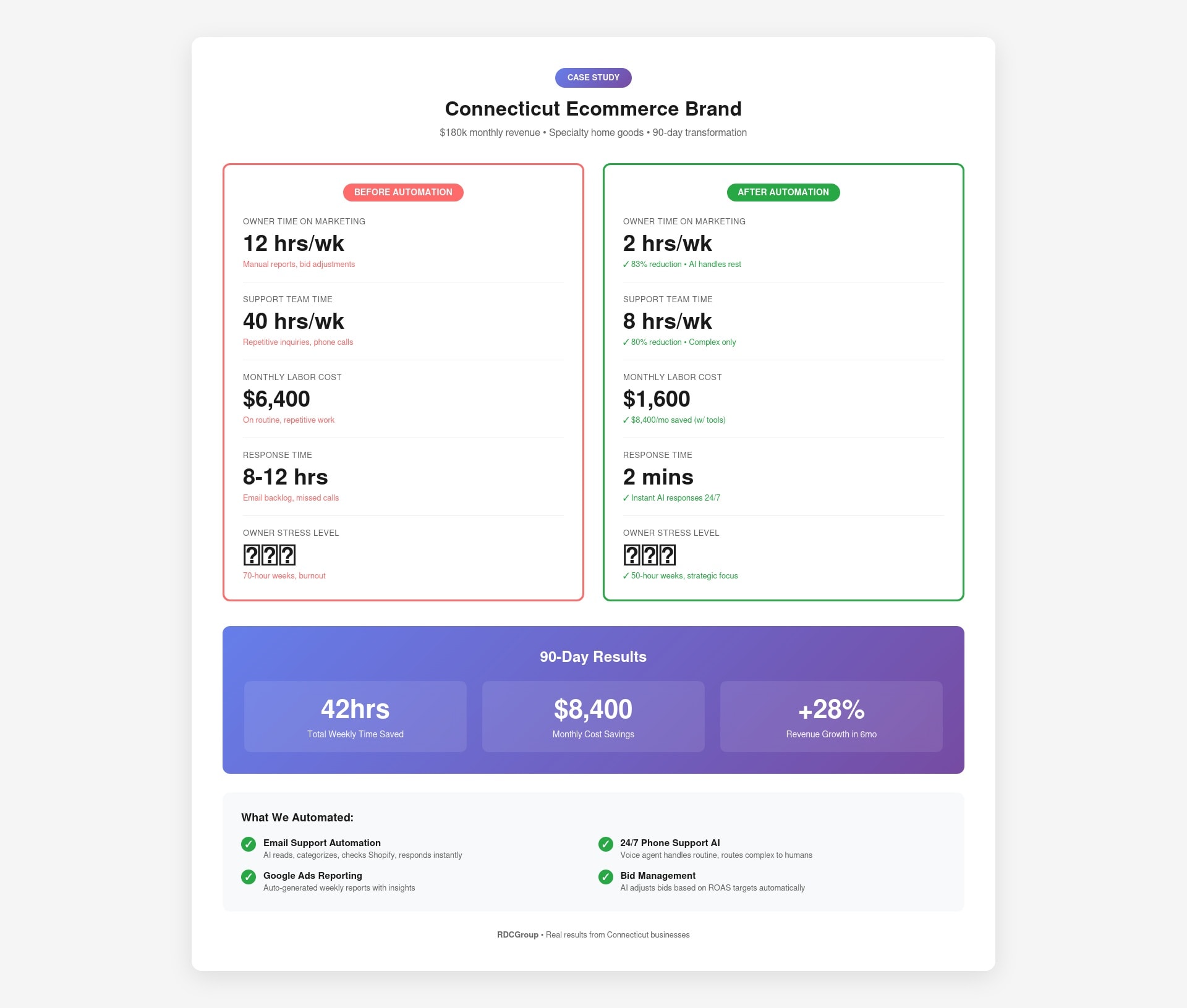In this article, I'll show you exactly how three Connecticut businesses—an ecommerce brand, a law firm, and a marketing agency—used automation to reclaim 15-40 hours weekly while saving $5,000-$15,000 monthly. These aren't theoretical case studies. These are real businesses right here in Connecticut that we've worked with at RDCGroup.
